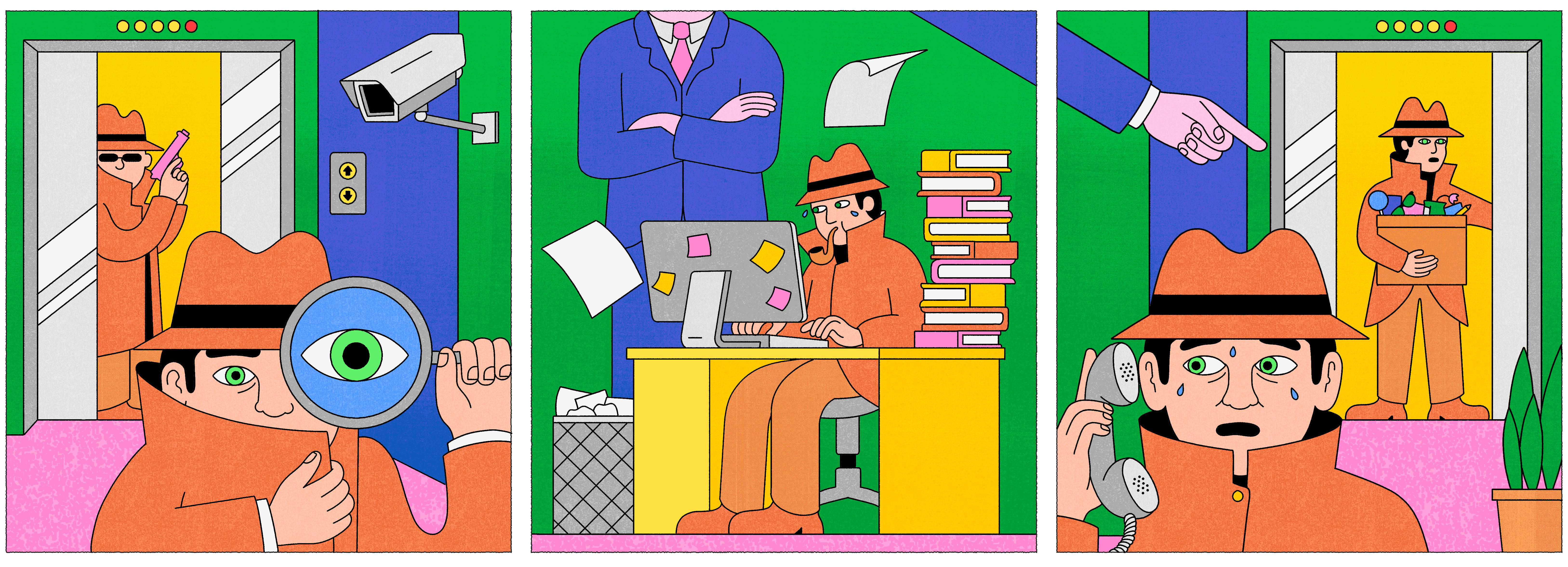 An illustration to accompany an article about a mans brief stint as a detective.